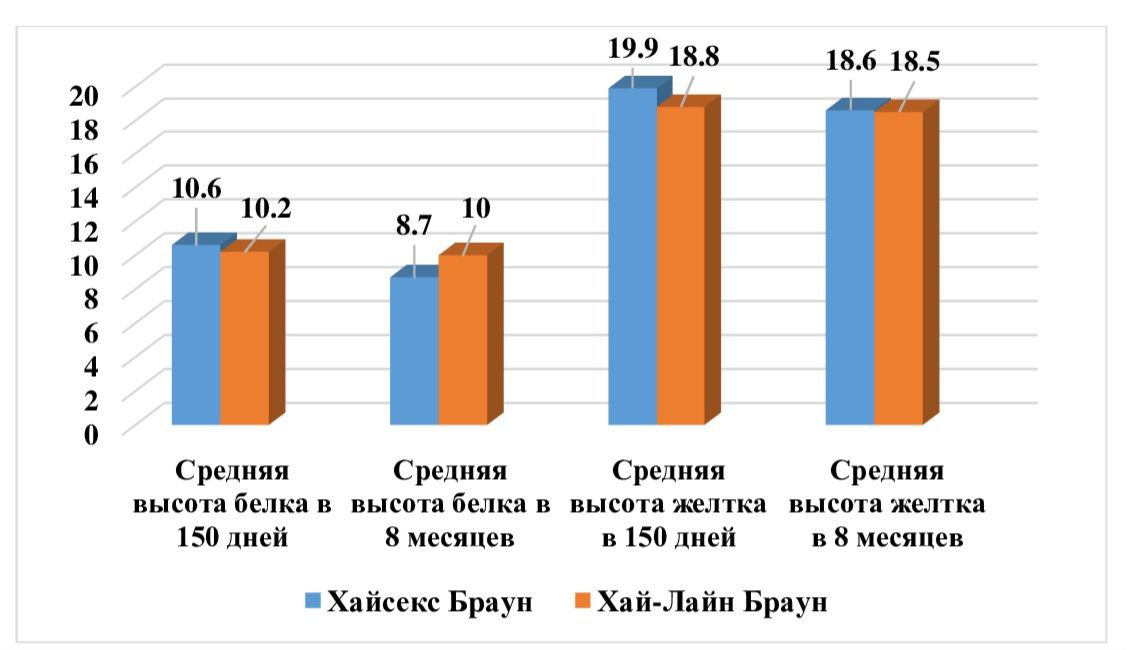 Рисунок 9 - Средняя высота белка и желтка кур несушек кроссов Хайсекс Браун и Хай-Лайн Браун в 150 дней и 8 месяцев