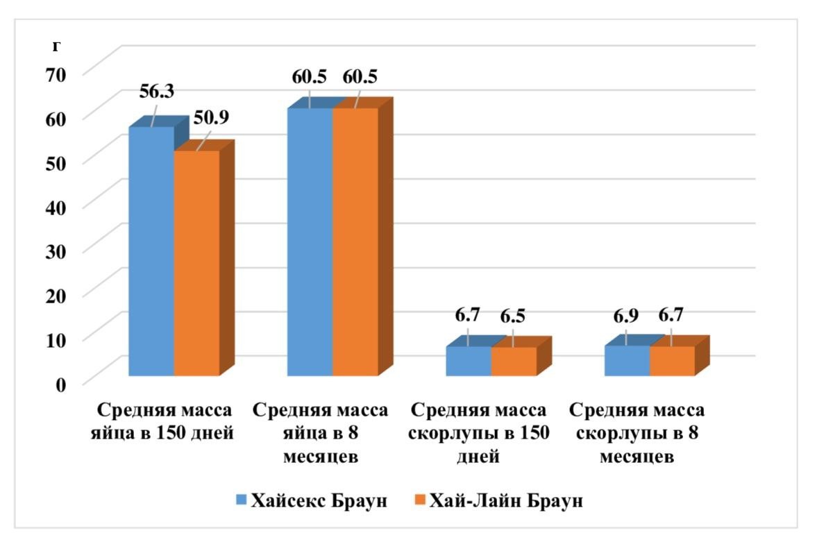 Рисунок 3 - Средняя масса яйца и скорлупы кур-несушек кроссов Хайсекс Браун и Хай-Лайн Браун в 150 дней и 8 месяцев