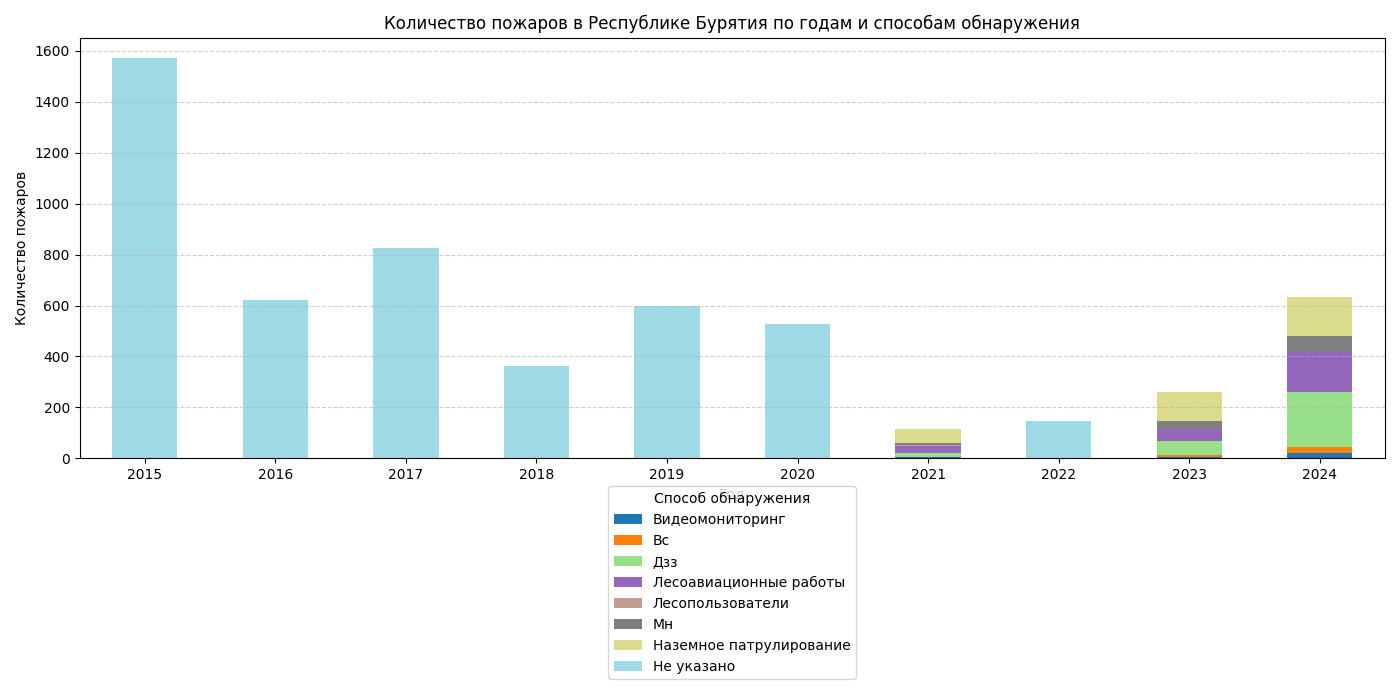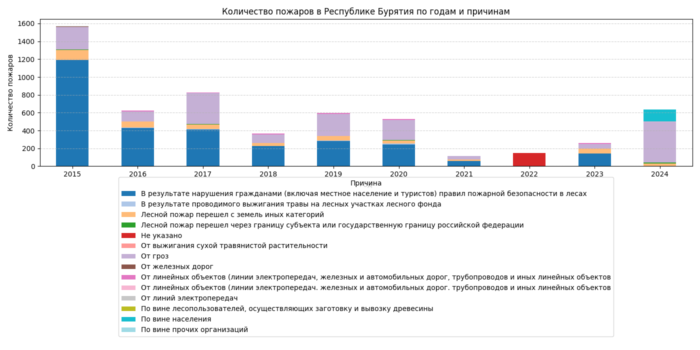 Анализ данных о пожарах в Республике Бурятия за период с 2015 по 2024 гг. показал, что: