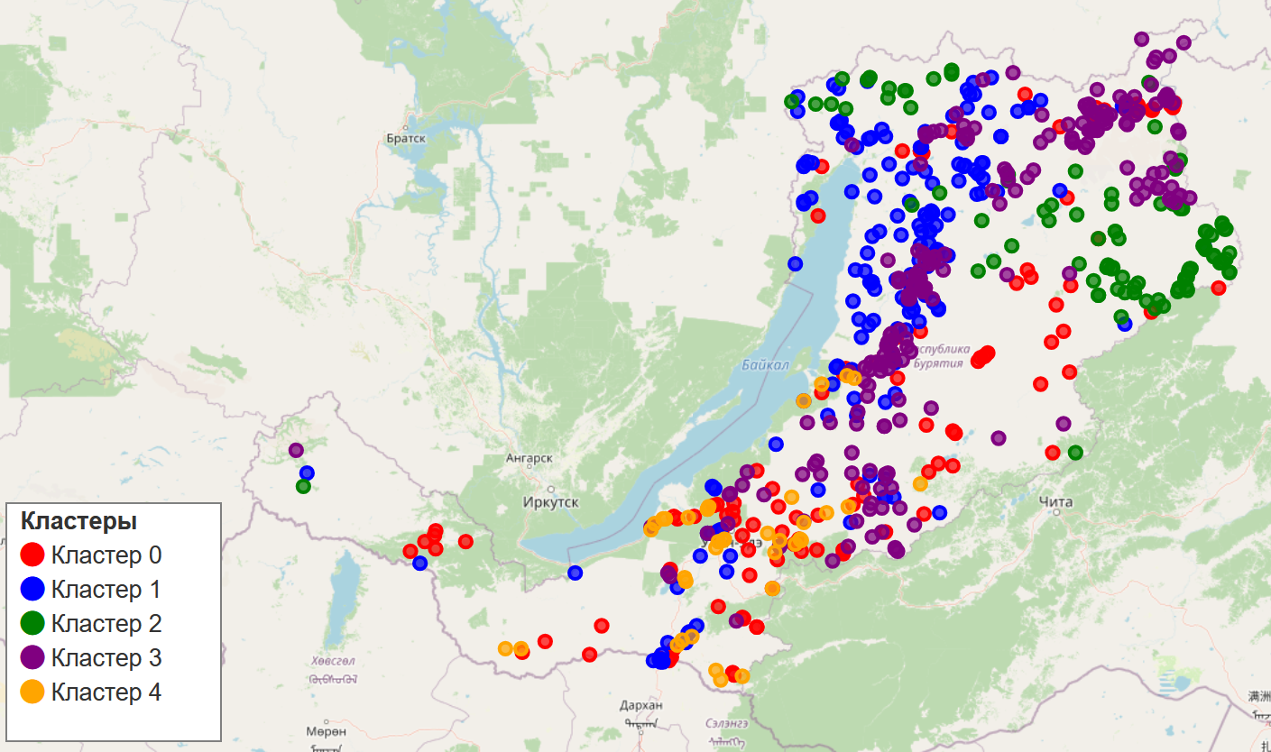 Кластеризация исходных данных позволила выявить основные признаки, по которым нужно проводить дальнейший анализ. Получено пять кластеров, демонстрирующие группировку данных по семи признакам, анализ которых показывает, что информативность некоторых признаков таких, как «Категория земель» и «Тип покрова» является низкой и не способствует выделению уникальных кластеров по этим признакам. Это связано с тем, что на территории Республики Бурятия доминирует категория земель «Естественные насаждения» и тип покрова «Травяной». Поэтому была проведена повторная кластеризация без низкоинформативных признаков, и в результате было получено также пять кластеров.