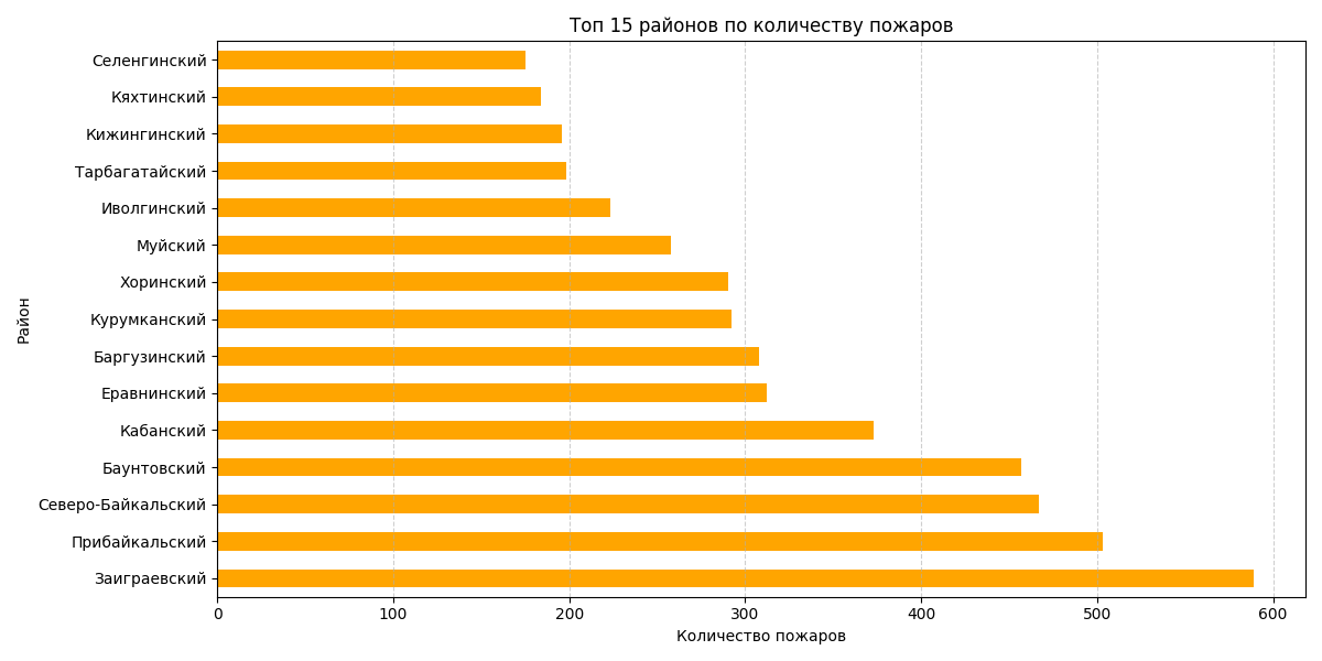 Проведенный предварительный анализ лесных пожаров в Республике Бурятия по историческим данных Геоинформационного портала «Природа Бурятии» показал, что наиболее частые очаги возгорания лесных массивов, находящихся вблизи населенных пунктов, происходят по причине антропогенных факторов. Природные факторы, такие как грозы, являются причиной возгорания в лесных массивах, удаленных от населенных пунктов, и горных местностях. Наиболее частые пожары возникают в определенные временные интервалы: это начало летних месяцев (июнь), когда население активизируется в связи с началом сельскохозяйственных работ, во время отпусков, по дням недели — это конец рабочей недели, когда население выезжает отдыхать на природу, а также по времени суток – это дневные часы. Распределение пожаров по районам республики показывает наиболее уязвимые районы.