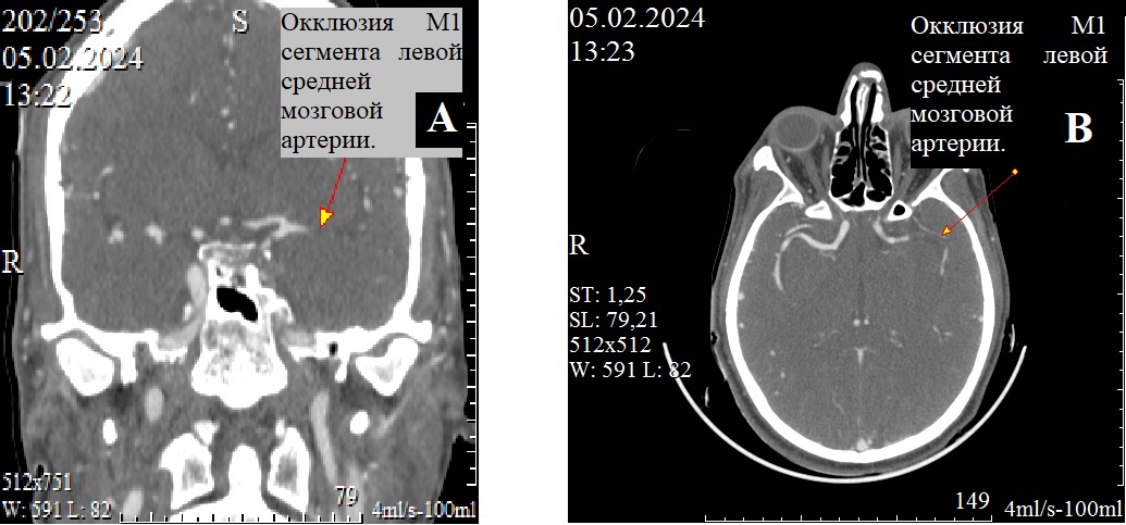 Рисунок 1 - Ангиографические признаки окклюзии М1 сегмента левой средней мозговой артерии