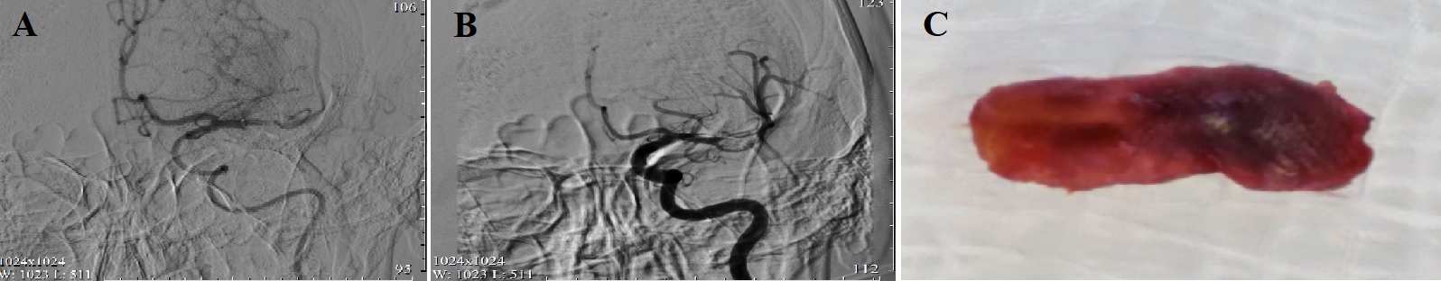 Рисунок 1 - Результаты ангиографии до (А) и после (В) выполнения тромболизиса и тромбоэкстракции: М1 сегмент контрастируется, магистральный кровоток в бассейне левой средней мозговой артерии восстановлен; извлеченный тромб 2х5 мм (С)