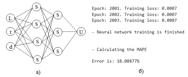 Рисунок 2 - Структура модернизированной ИНС (а) и результат обучения по амплитуде FEXT (б)