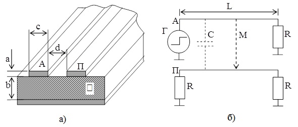Объектом исследования в работе является фрагмент печатной платы с активным (А) и пассивным (П) межсоединением (рис. 1). Конструктивные (a, b, c, d) и электрофизические параметры (ℇ) данного фрагмента ПП соответствуют современному состоянию производства .