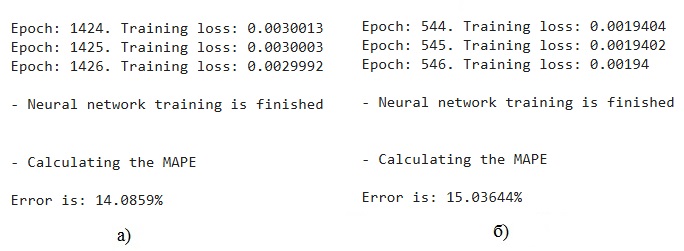 4. Для обучения ИНС использовался алгоритм обратного распространения ошибки . При обучении функция потерь составляло от 0,07 до 0,3%. Скорость обучения варьировалось от 0,07 до 0,1. Для оценки качества решения задачи по тестовой выборке используется средняя абсолютная процентная ошибка (MAPE) .