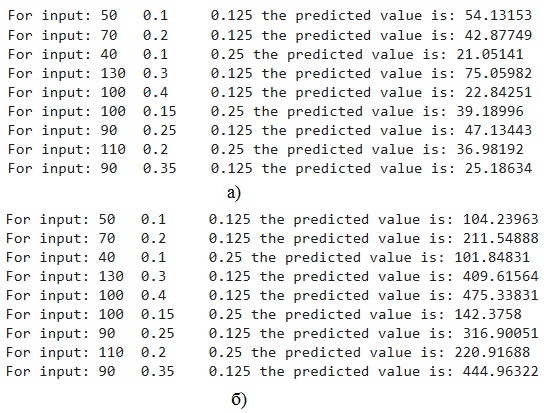 Рисунок 3 - Результат обучения ИНС по данным максимальной амплитуды (а) и длительности (б) помех NEXT