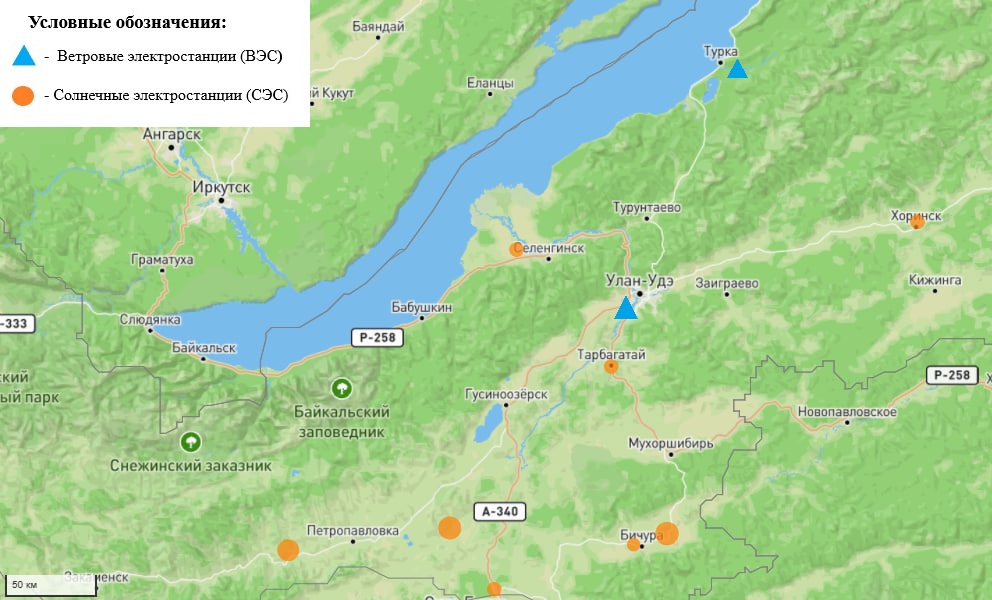 Рисунок 1 - Расположение объектов альтернативной энергетики в Республике Бурятии