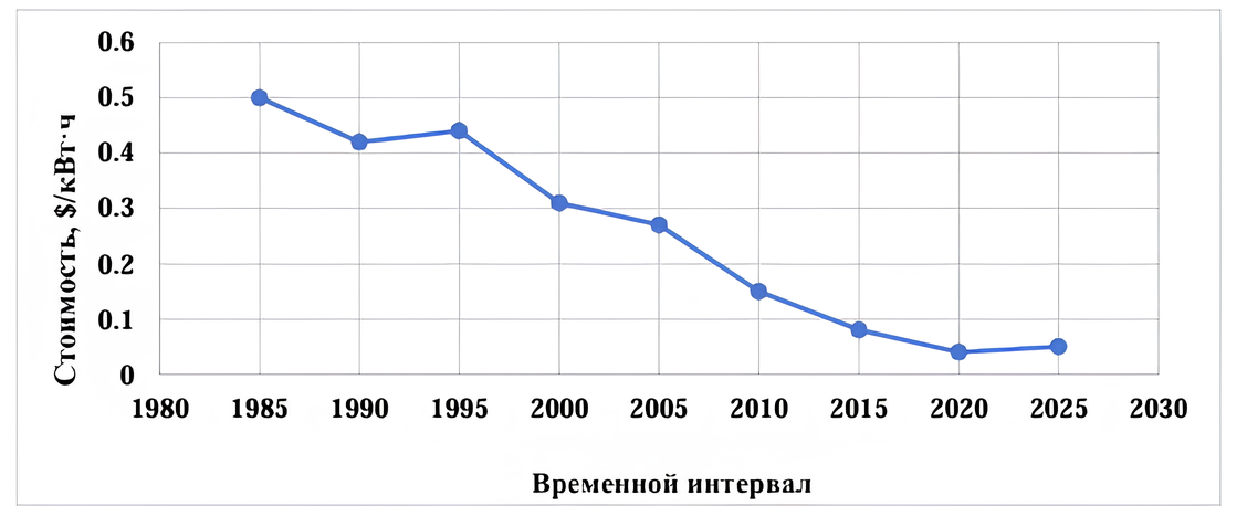 Рисунок 3 - Стоимость электроэнергии, вырабатываемой ВЭУ в 1985-2025 гг.