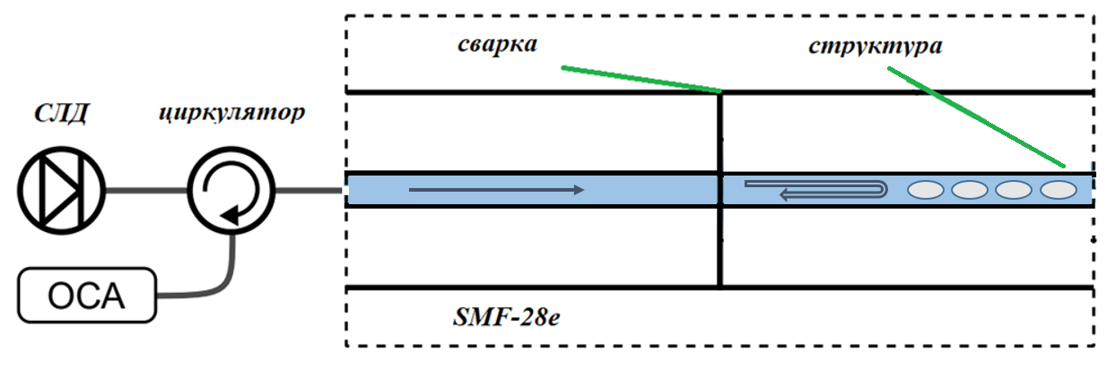 Был поставлен эксперимент, нацеленный на изучение влияния длины ВКПС на её спектральные характеристики. Для чего были сформированы полостные структуры путем формирования оптического разряда на заданную длину в сердцевине одномодового изотропного оптического волокна со следующими характеристиками: диаметры сердцевины dcore=8 мкм, оболочки dshell=125 мкм и акрилатного защитно-упрочняющего покрытия dcoat=250 мкм, числовая апертура NA=0,13.