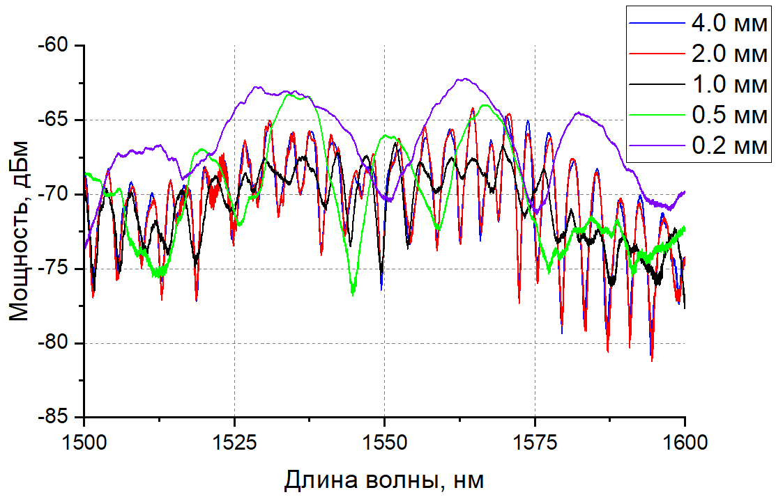 Заметно, что при стачивании структуры увеличивается свободный спектральный диапазон, при этом мощность отражения возрастает, что связано с уменьшением количества взаимодействующих внутриволоконных полостей и влиянием отражения от торца структуры оболочечных мод. Интерференционный контраст слабо зависит от длины структуры.