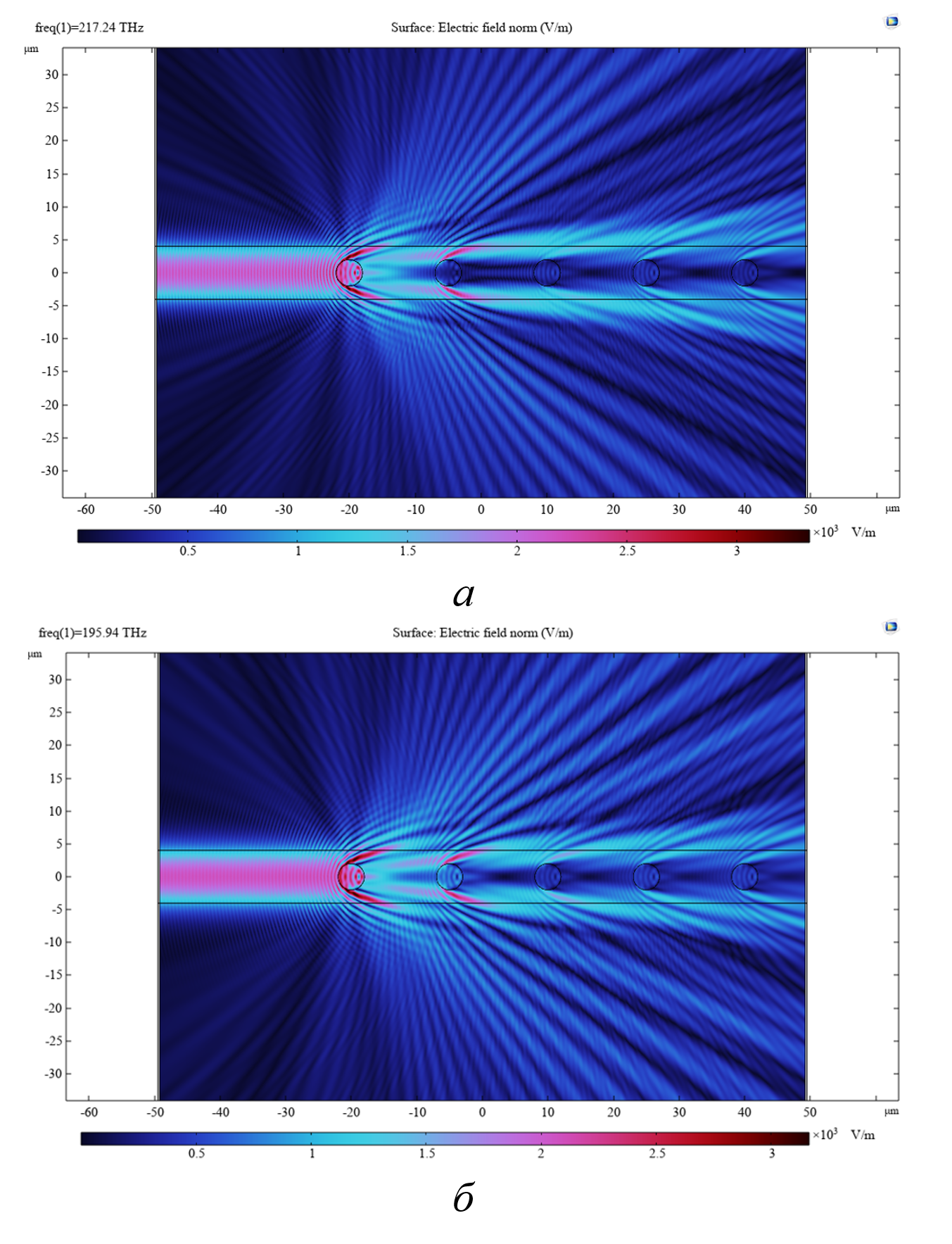 а – длина волны 1380 нм (217,2409 ТГц); б – длина волны 1530 нм (195,9428 ТГц)