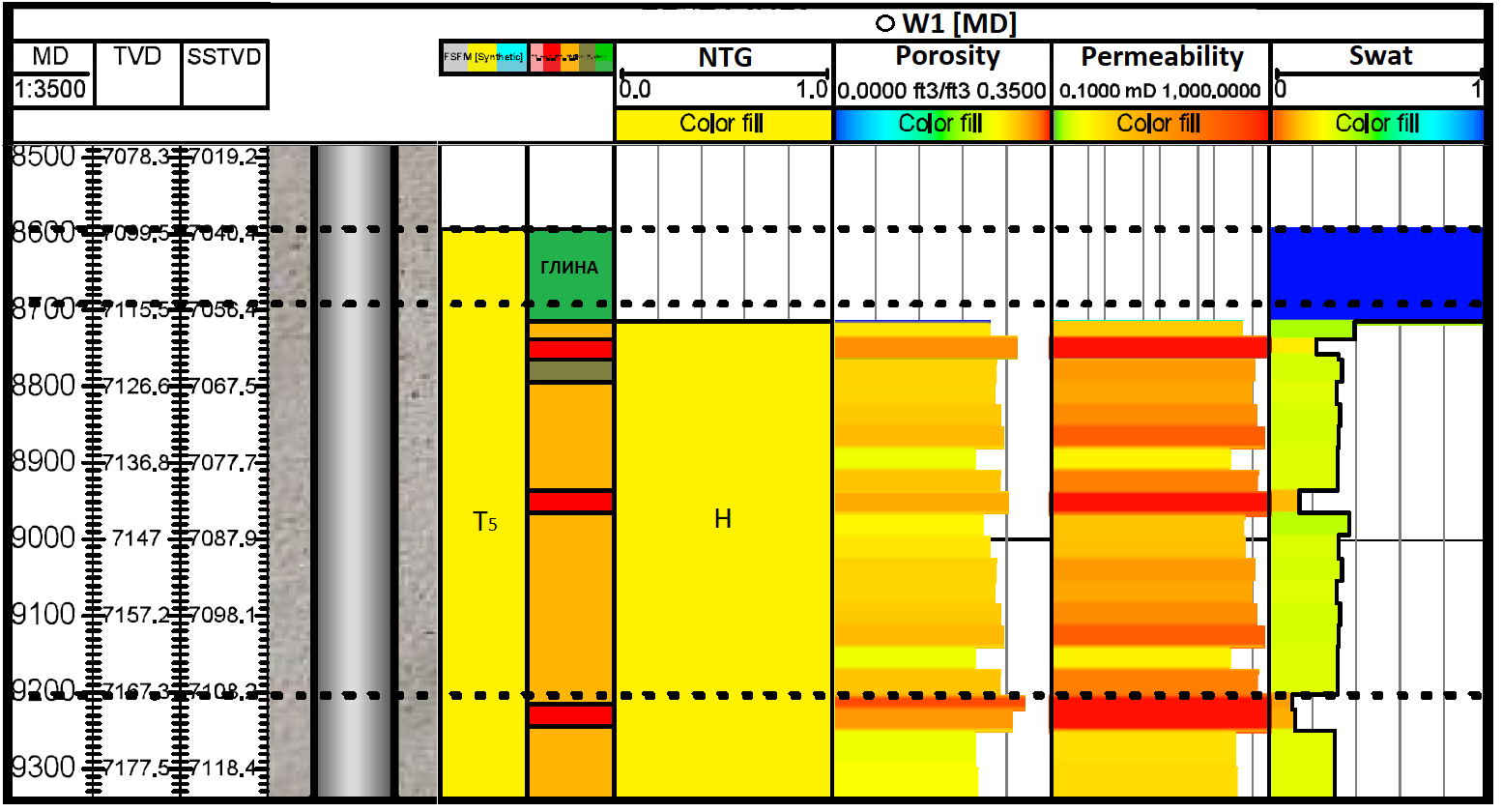 MD – измеренная глубина; TVD – абсолютная глубина; SSTVD – абсолютная глубина от уровня моря; NTG – коэффициент доли коллектора; Swat – водонасыщенность