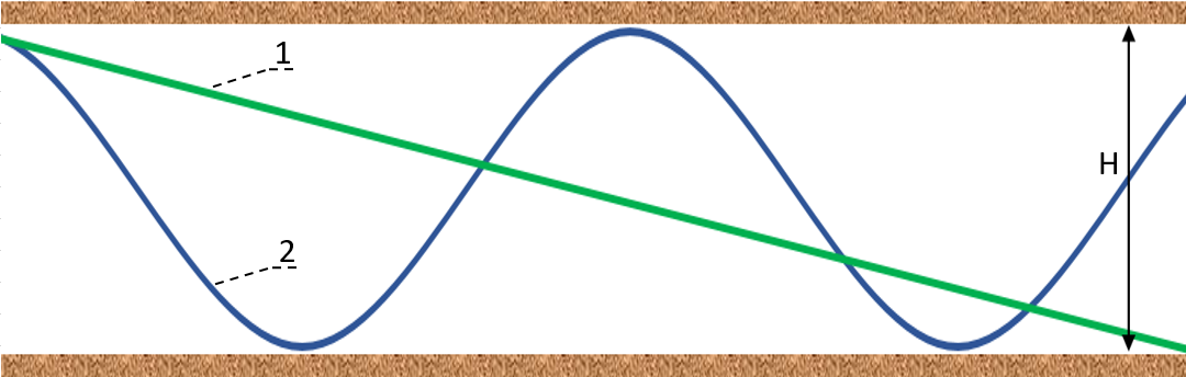 Рисунок 1 - Траектория скважин пологого (1) и волнообразного профиля (2) в газоносном продуктивном пласте мощностью Н