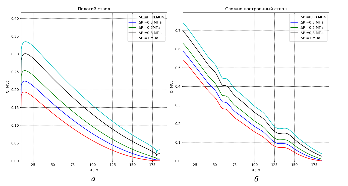 Рисунок 4 - Распределение притока вдоль ствола пологой (а) и волнообразной (б) скважин
