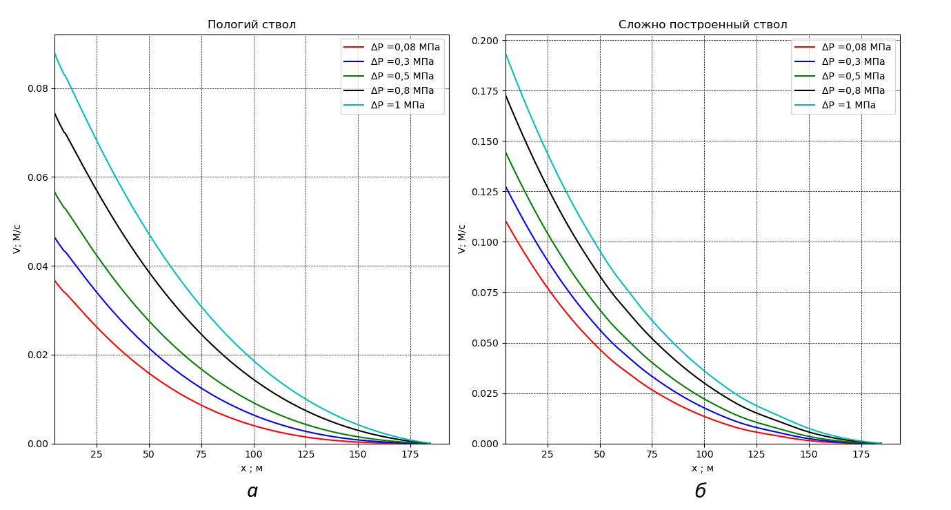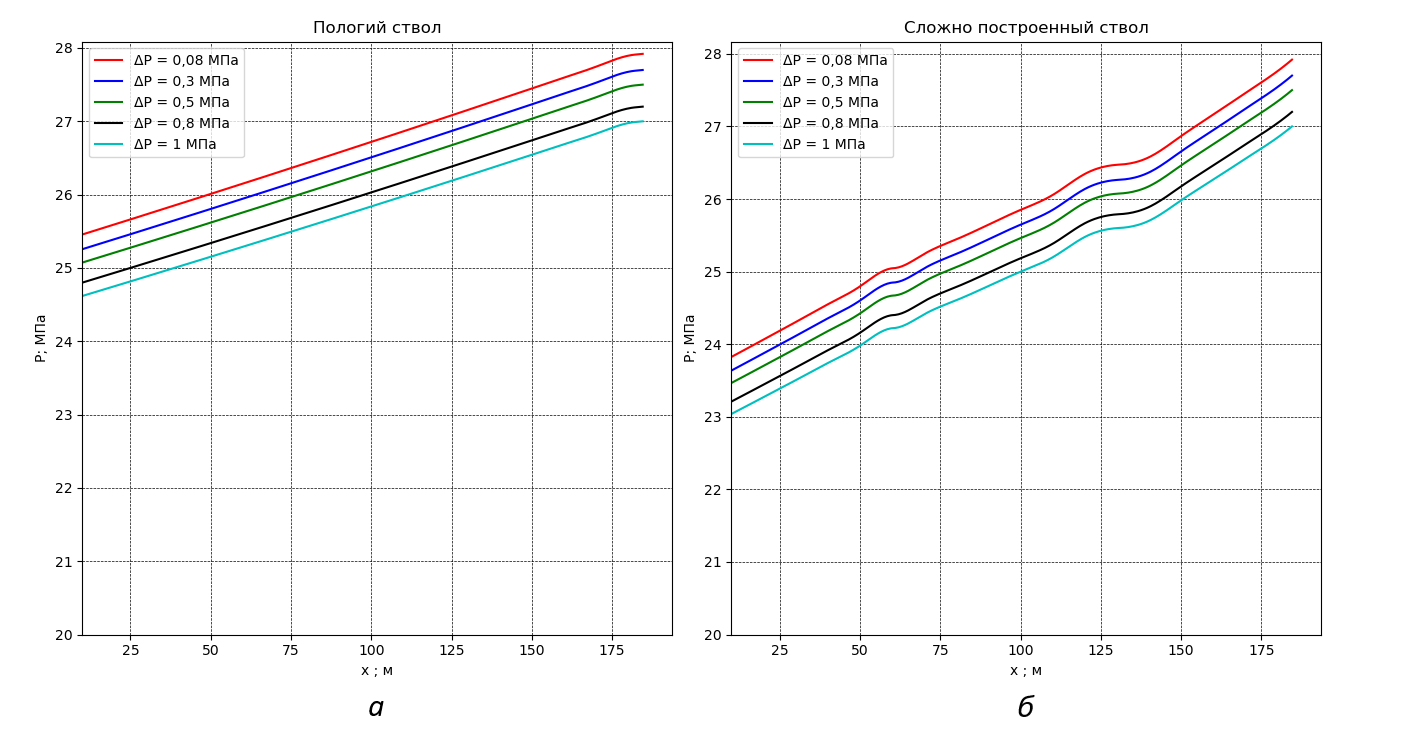 Рисунок 5 - Распределение давления по пологой (а) и волнообразной (б) скважине