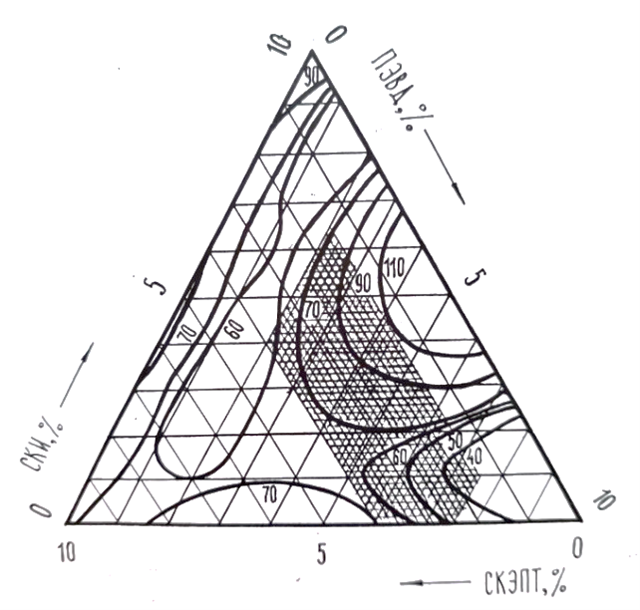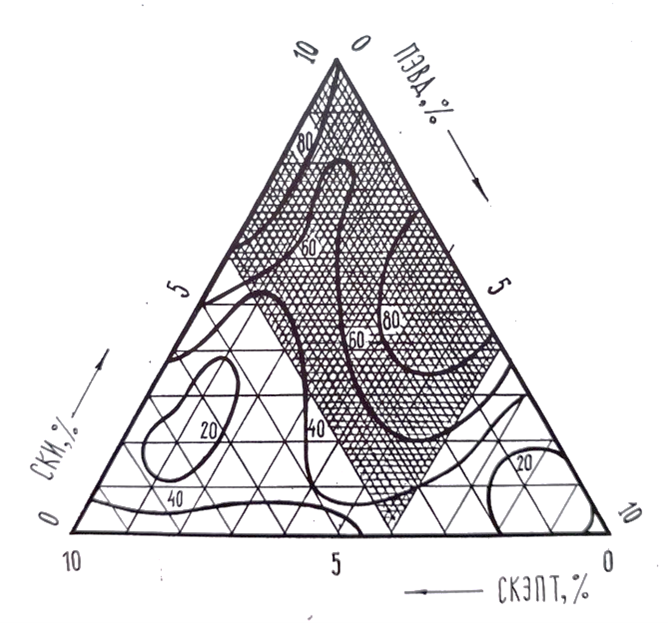 Зависимость технологических и эксплуатационных свойств полимерных композиций от соотношения компонентов ТЭП, входящих в состав БПК, наиболее удобно представлять в виде треугольных диаграмм «состав-свойство».